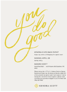 On Sunday, April 28th, 2019 Kendra Scott will be holding a fundraiser for Tell Every Amazing Lady® at SouthPark Mall in Charlotte, North Carolina. From 12:00-3:00 pm you can enjoy refreshments while shopping. 20% of the proceeds during this time will go to T.E.A.L.®. Can’t make the event? You can call 708-837-7689 in during the event to have items shipped to you and the proceeds will still go to T.E.A.L.® if you mention our name.