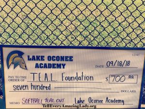 The Lady Titans Softball team from Lake Oconee Academy in Georgia, hosted a teal Out game on Tuesday, September 18th. Students and teachers were asked to wear a shirt designed for the game at school on Tuesday and to the game that evening. T.E.A.L.® supporter, Lea, was presented a check for $700 at the start of the varsity game. In addition to wearing teal jerseys and selling the t-shirts, the team also painted teal ribbons on the field and used teal bases. This was an amazing and fun way to raise awareness and funds for ovarian cancer!
