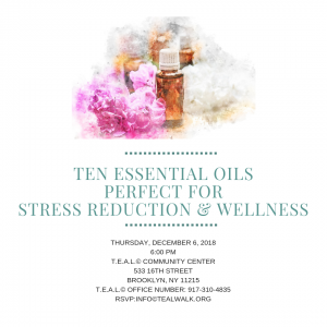 If you’ve ever felt stressed or overwhelmed. If you ever had trouble sleeping or difficulty concentrating, then you are not going to want to miss this! On Thursday, December 6th, 2018, T.E.A.L.® is hosting a workshop titled “Ten Essential Oils Perfect for Stress Reduction and Wellness.” It will be held at the T.E.A.L® Community Center, 533 16th Street, Brooklyn, NY from 6:00-7:30pm. There will be a talk with plenty of time for questions. In-house sampling, as it appropriate, will be available. Please RSVP to info@tealwalk.org